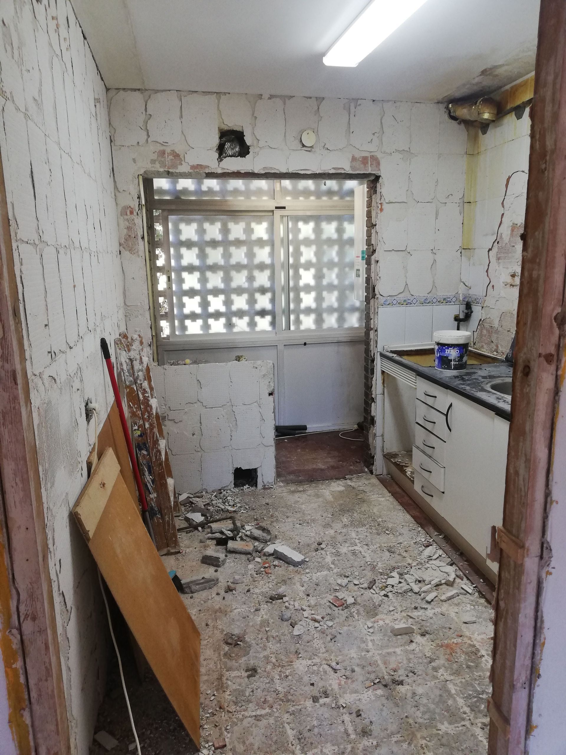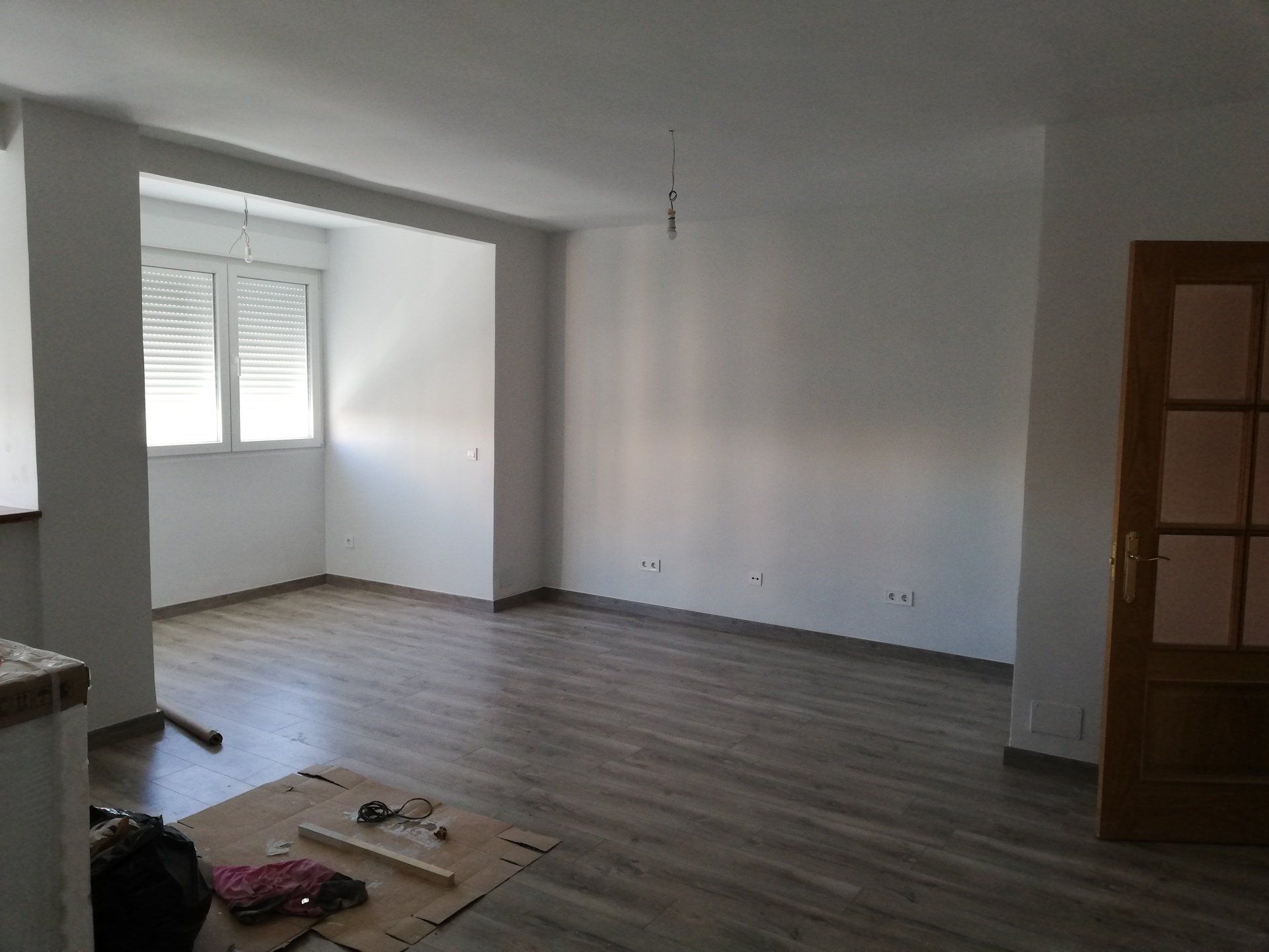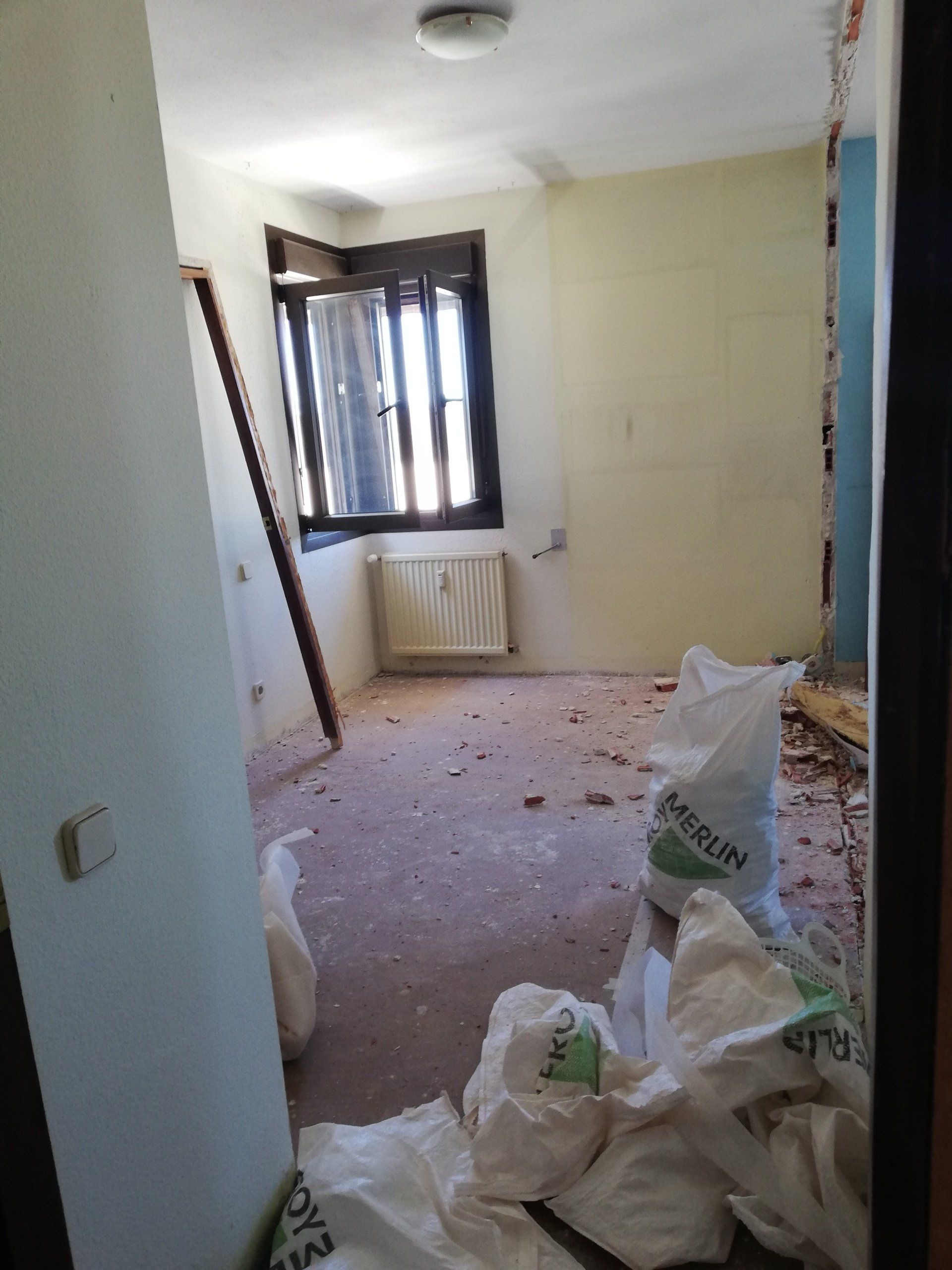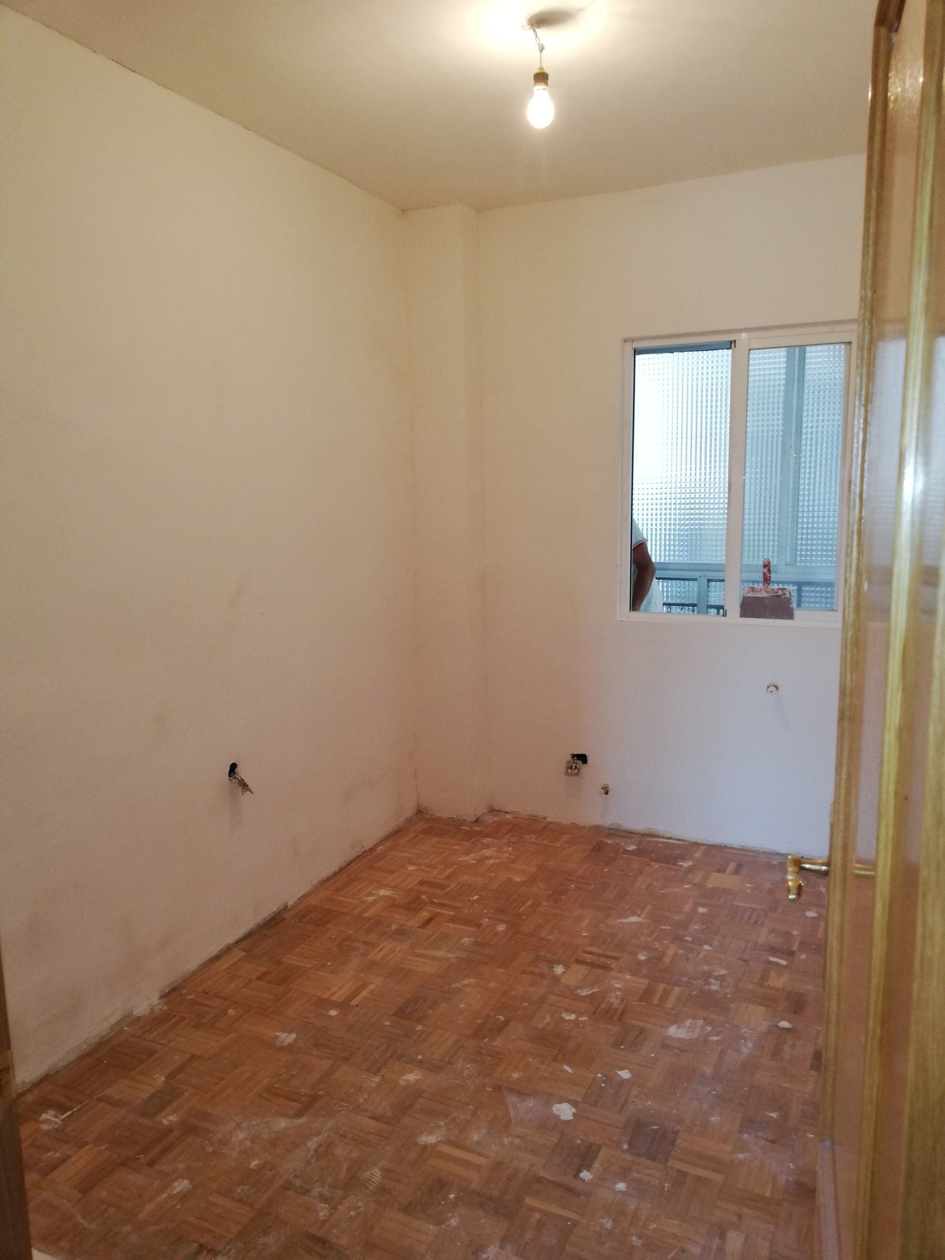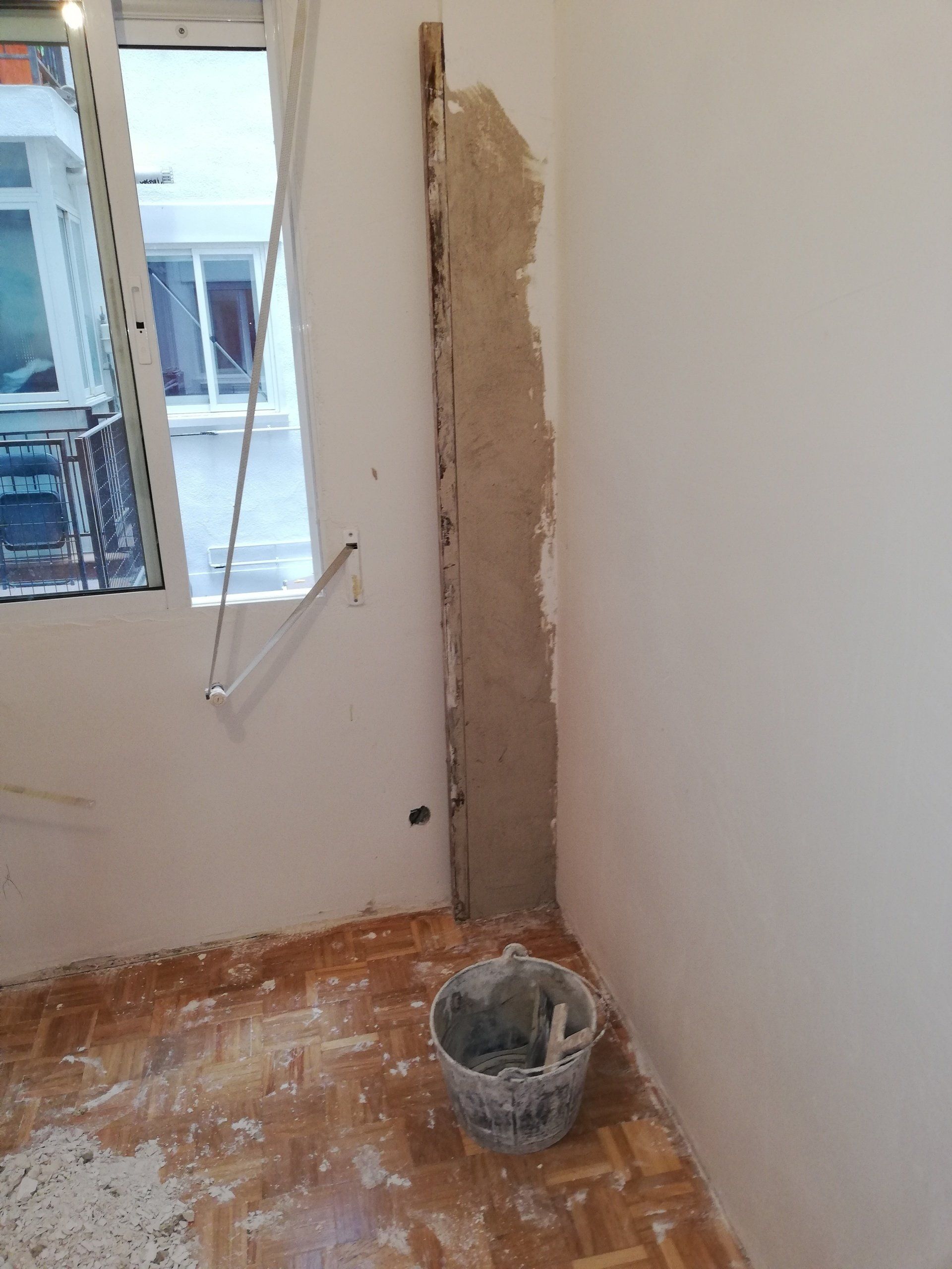 Abrir hueco de ventana en fachada, alisar paredes, levantar tabique para división de espacios, cambio de suelo.