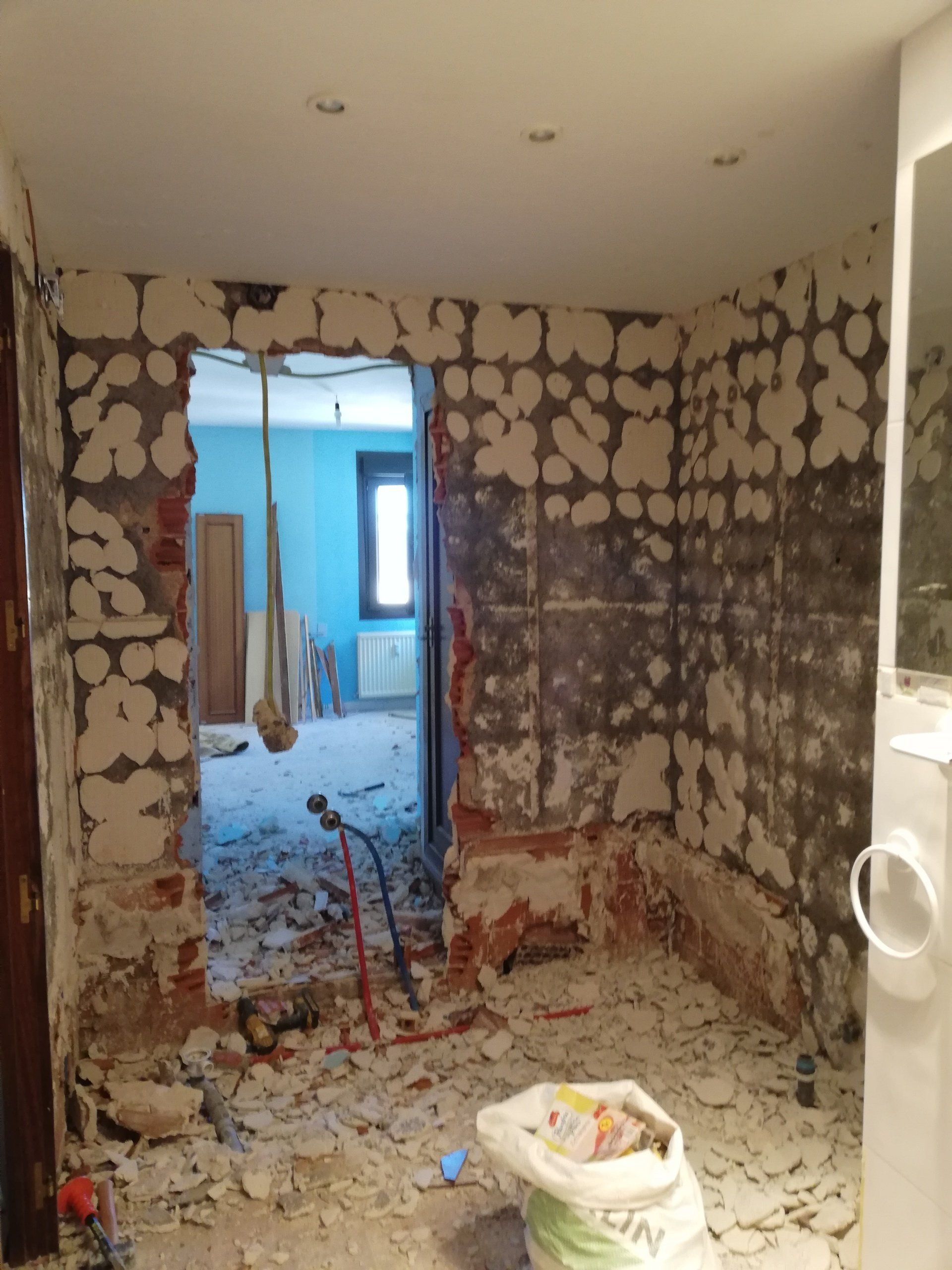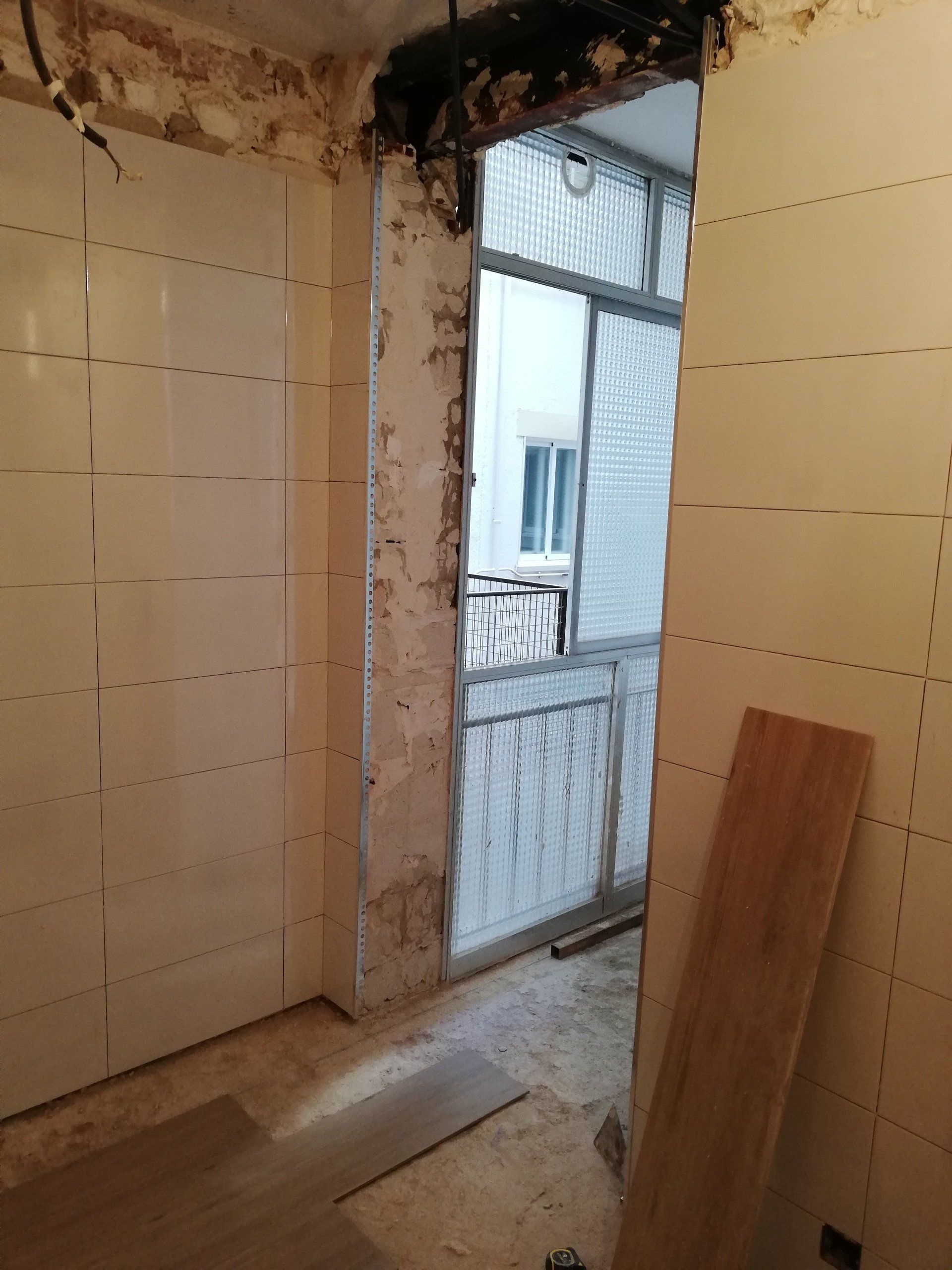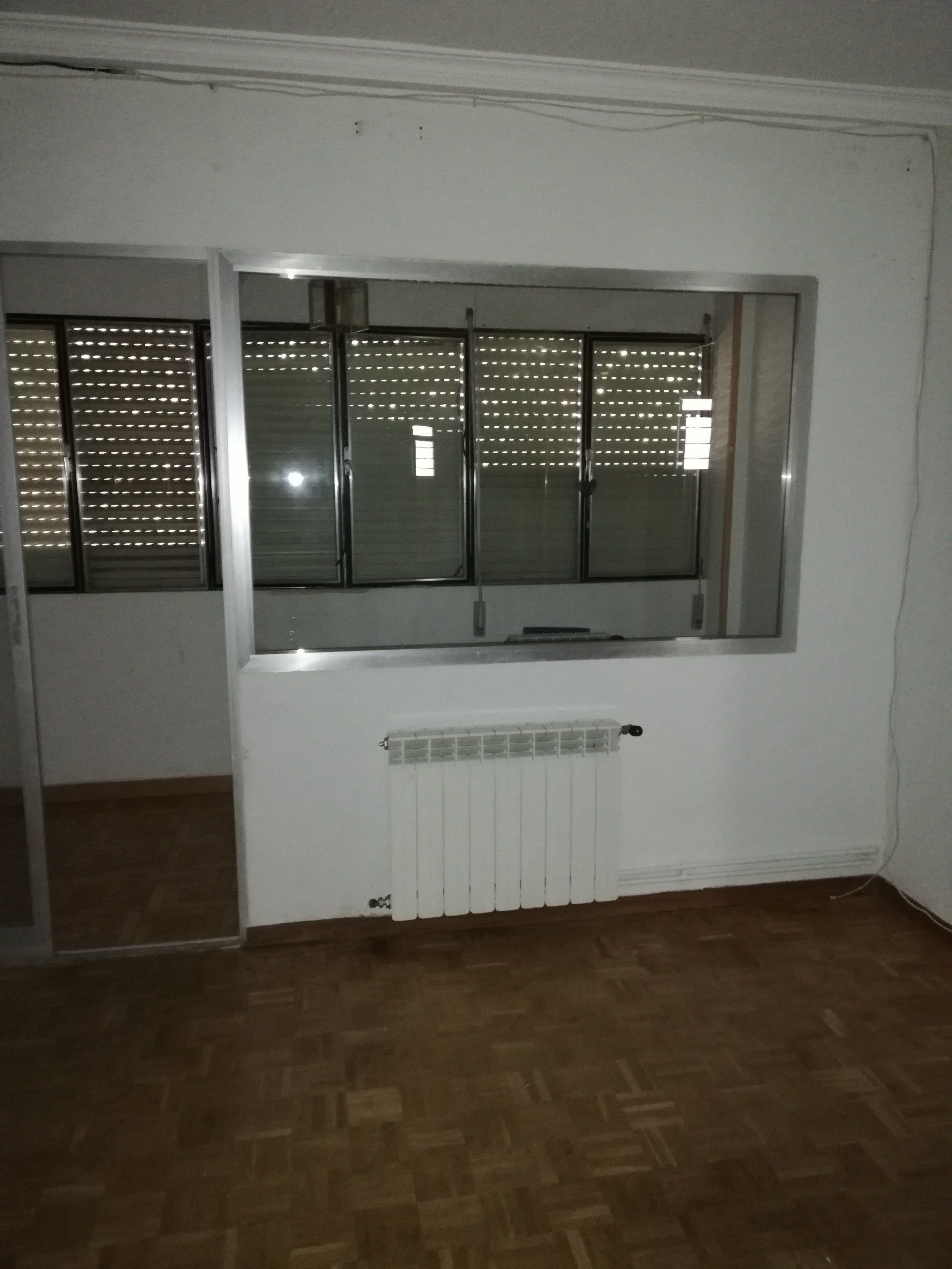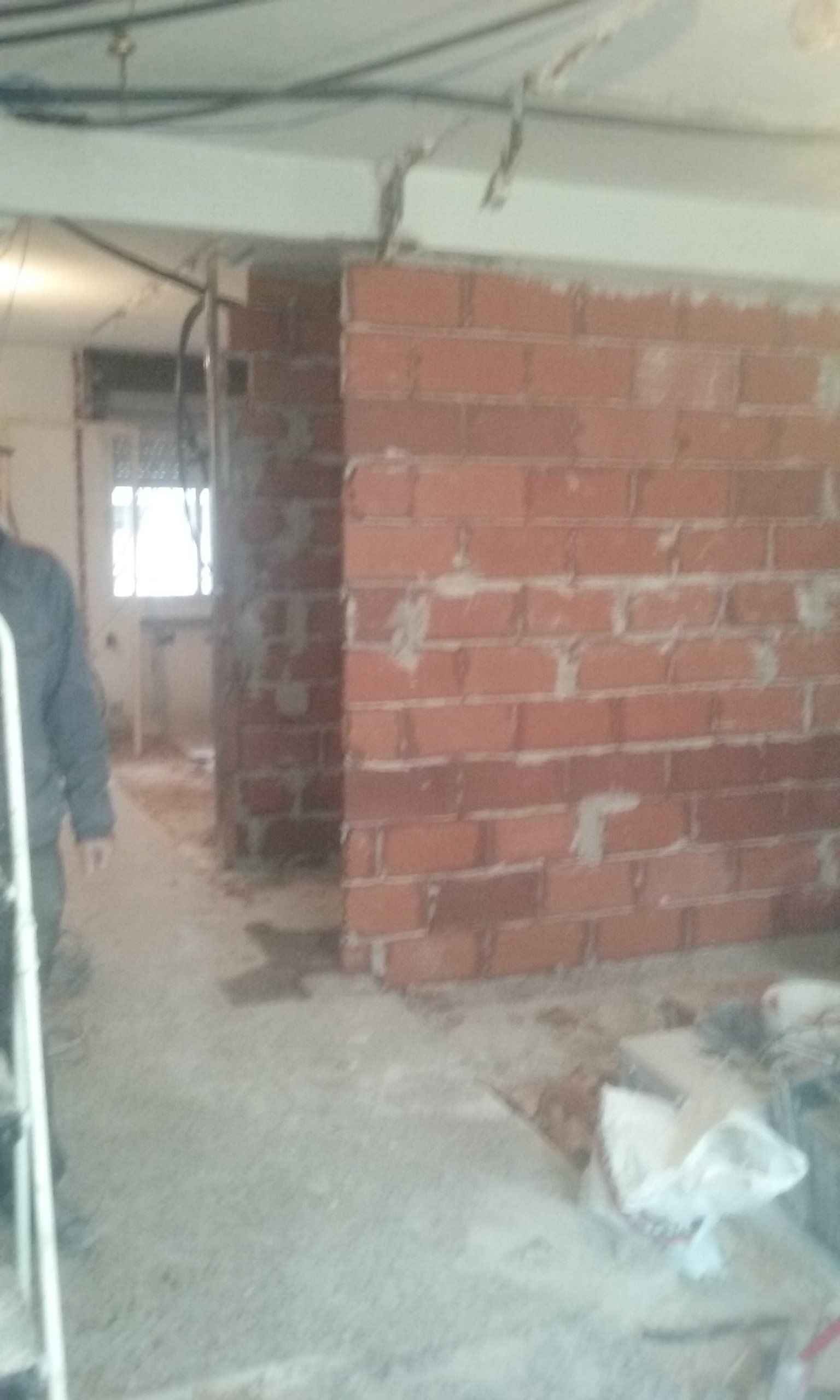 Abrir hueco de ventana en fachada, alisar paredes, levantar tabique para división de espacios, cambio de suelo.
