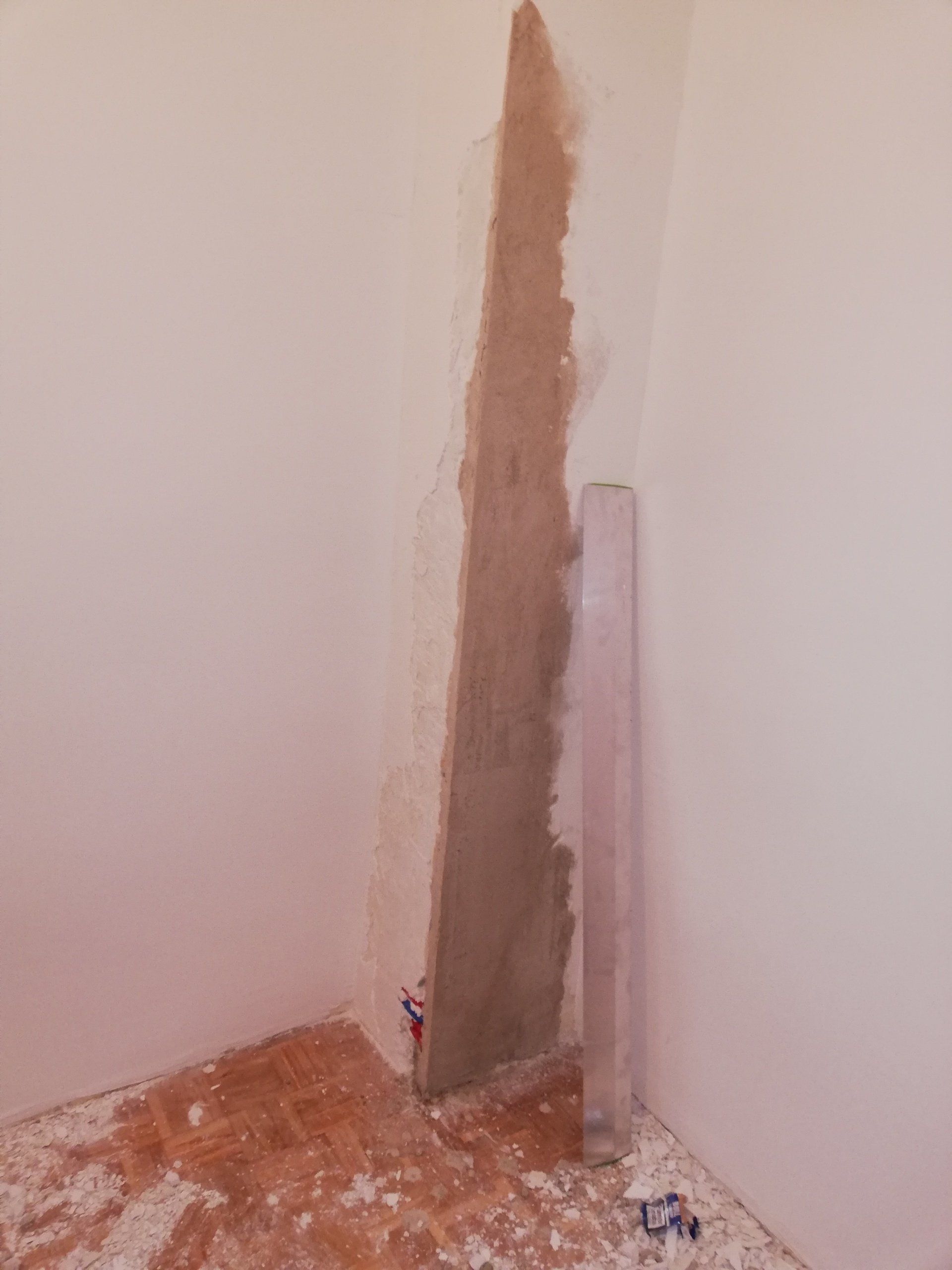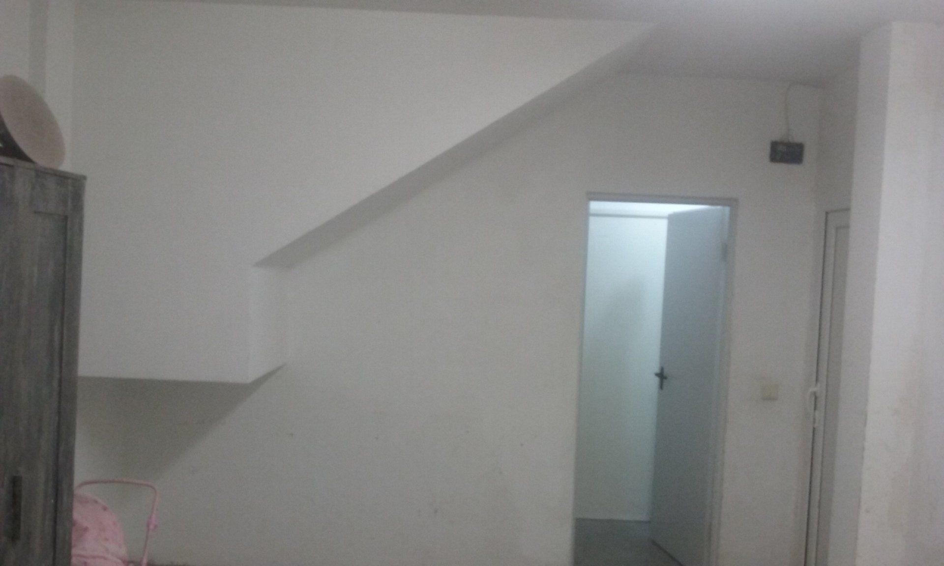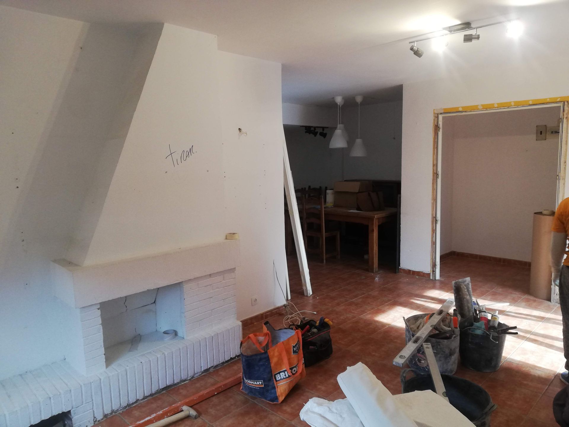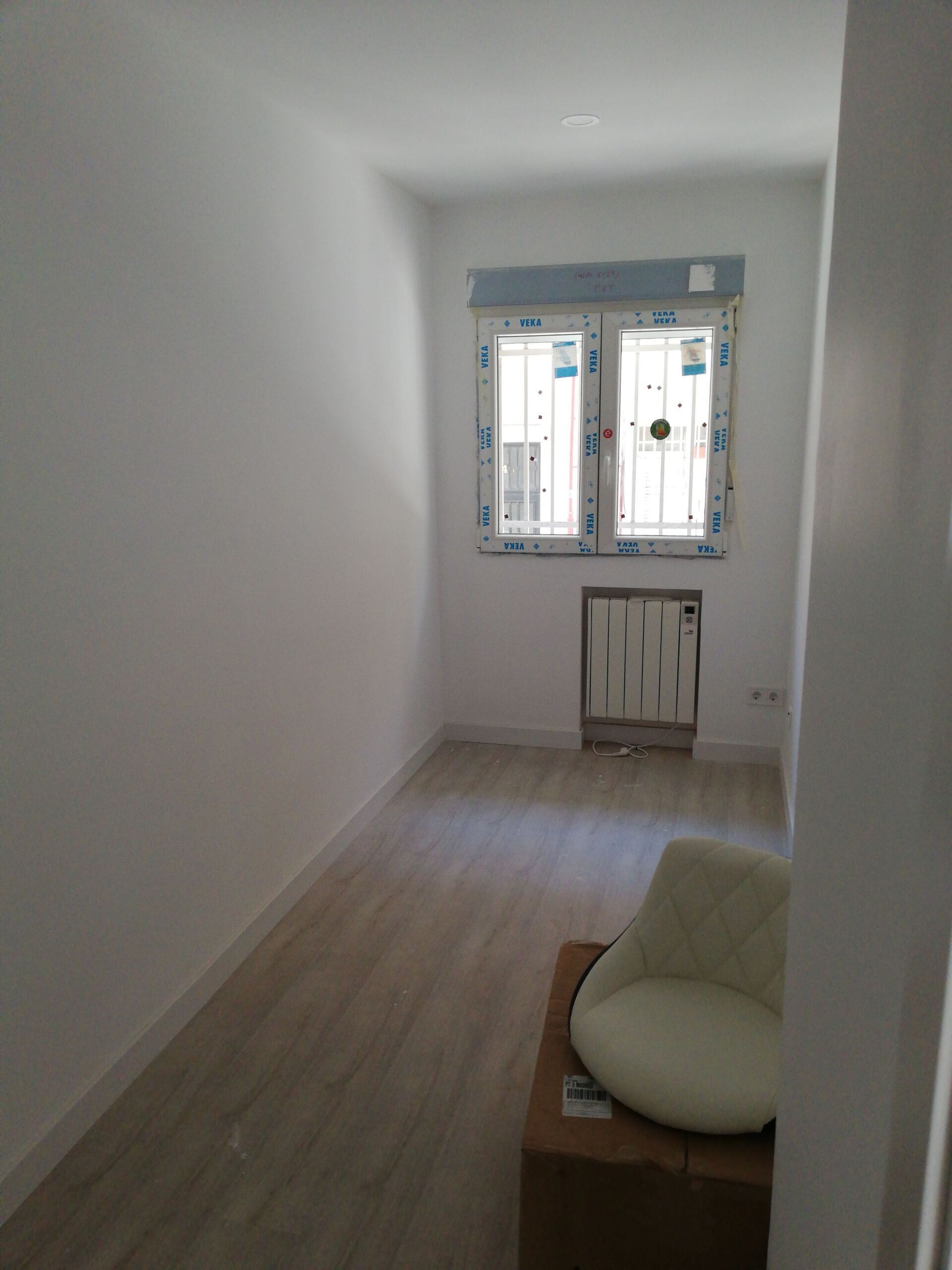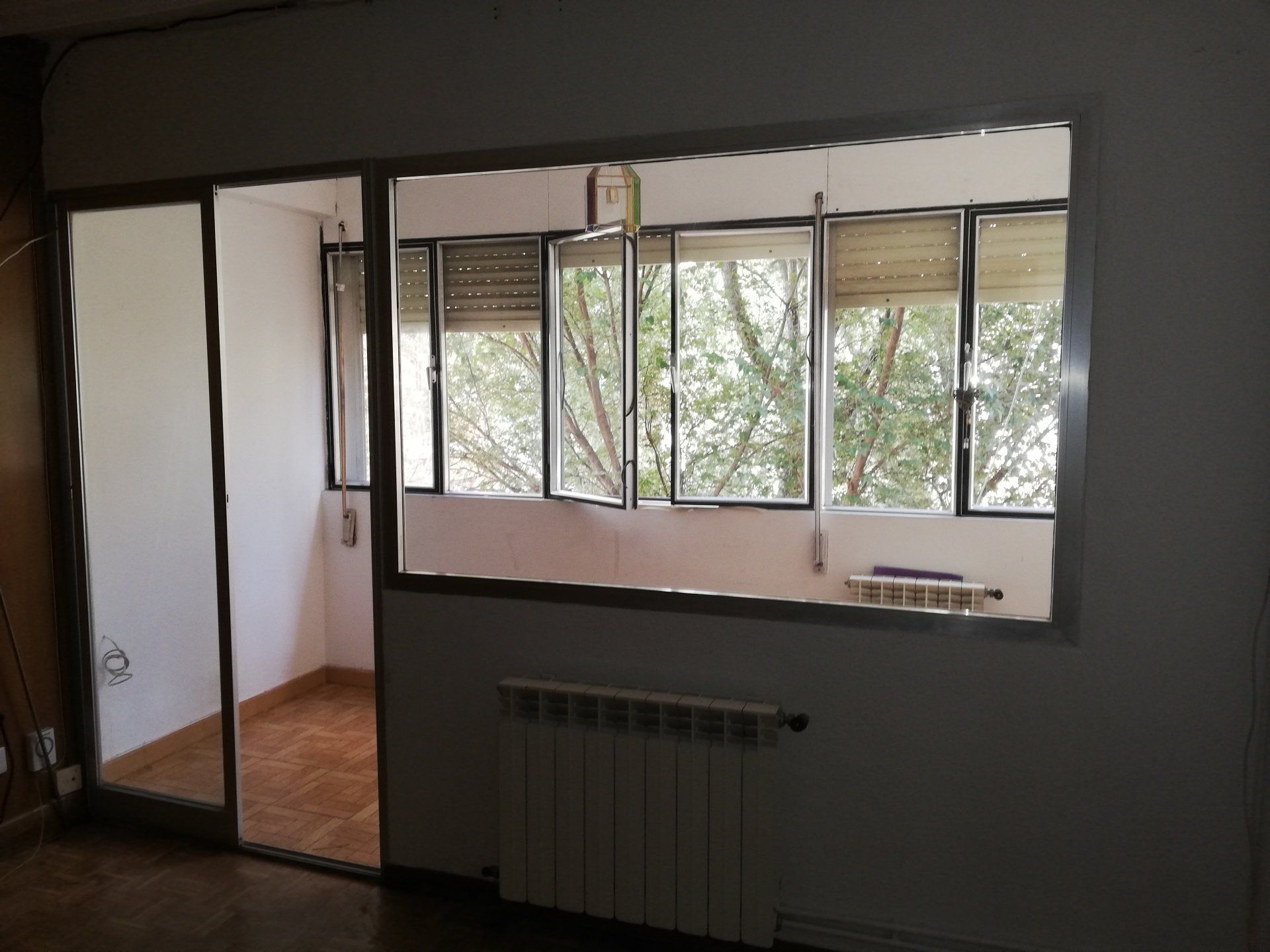 Abrir hueco de ventana en fachada, alisar paredes, levantar tabique para división de espacios, cambio de suelo.
