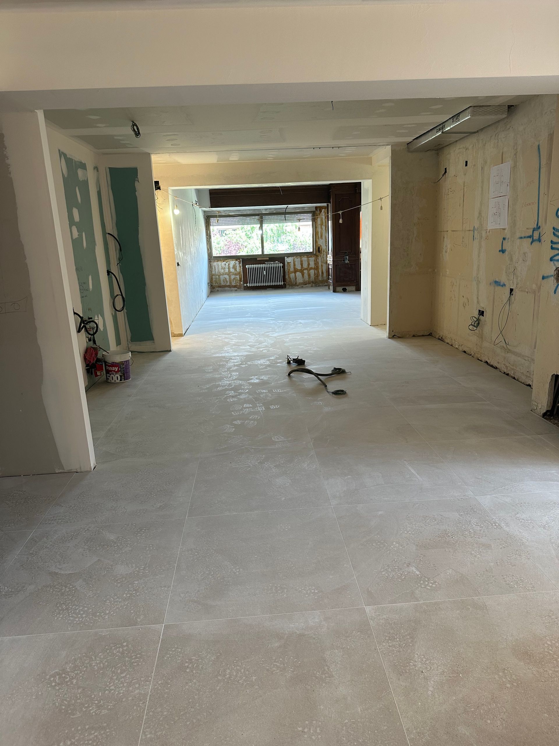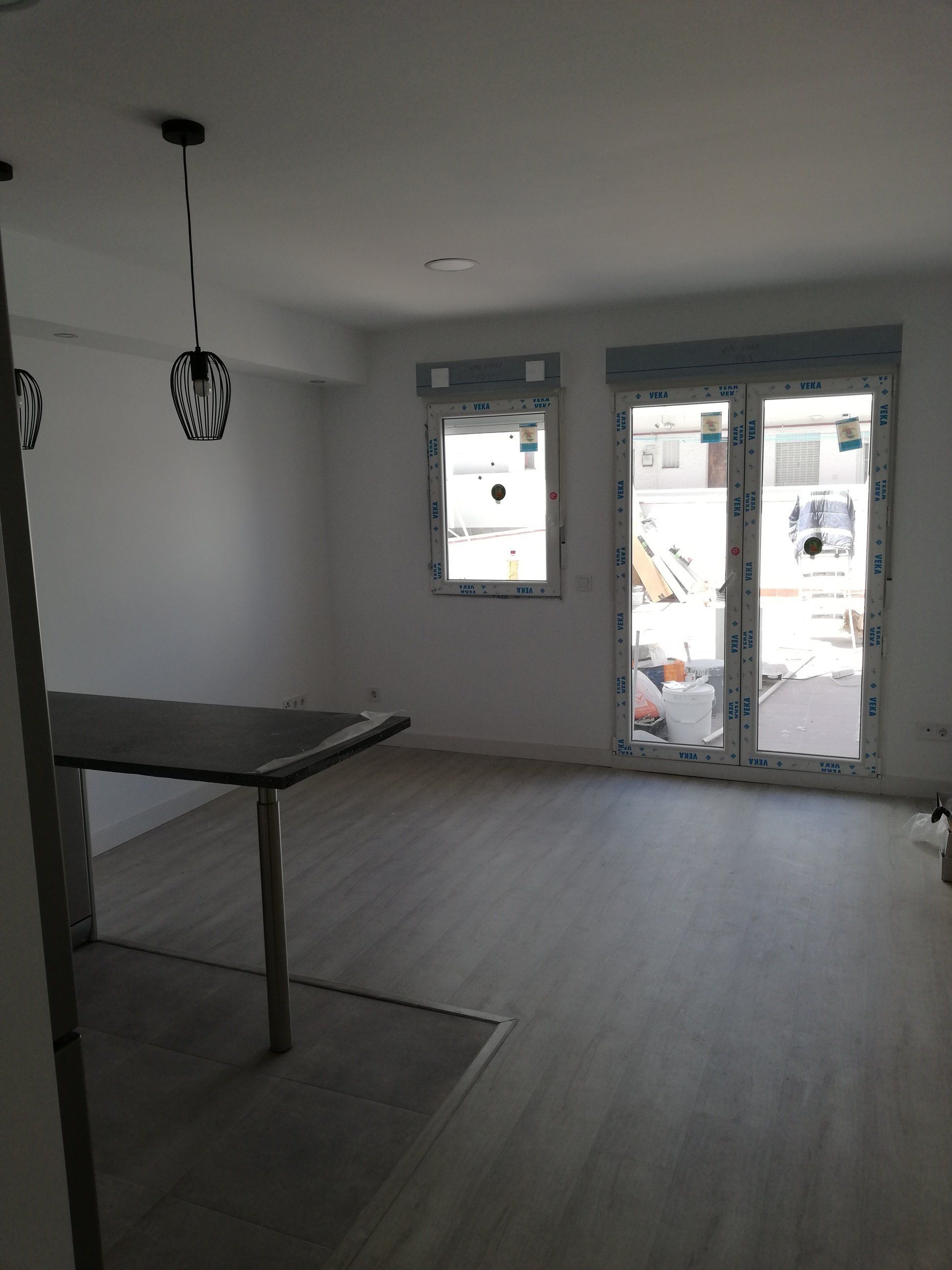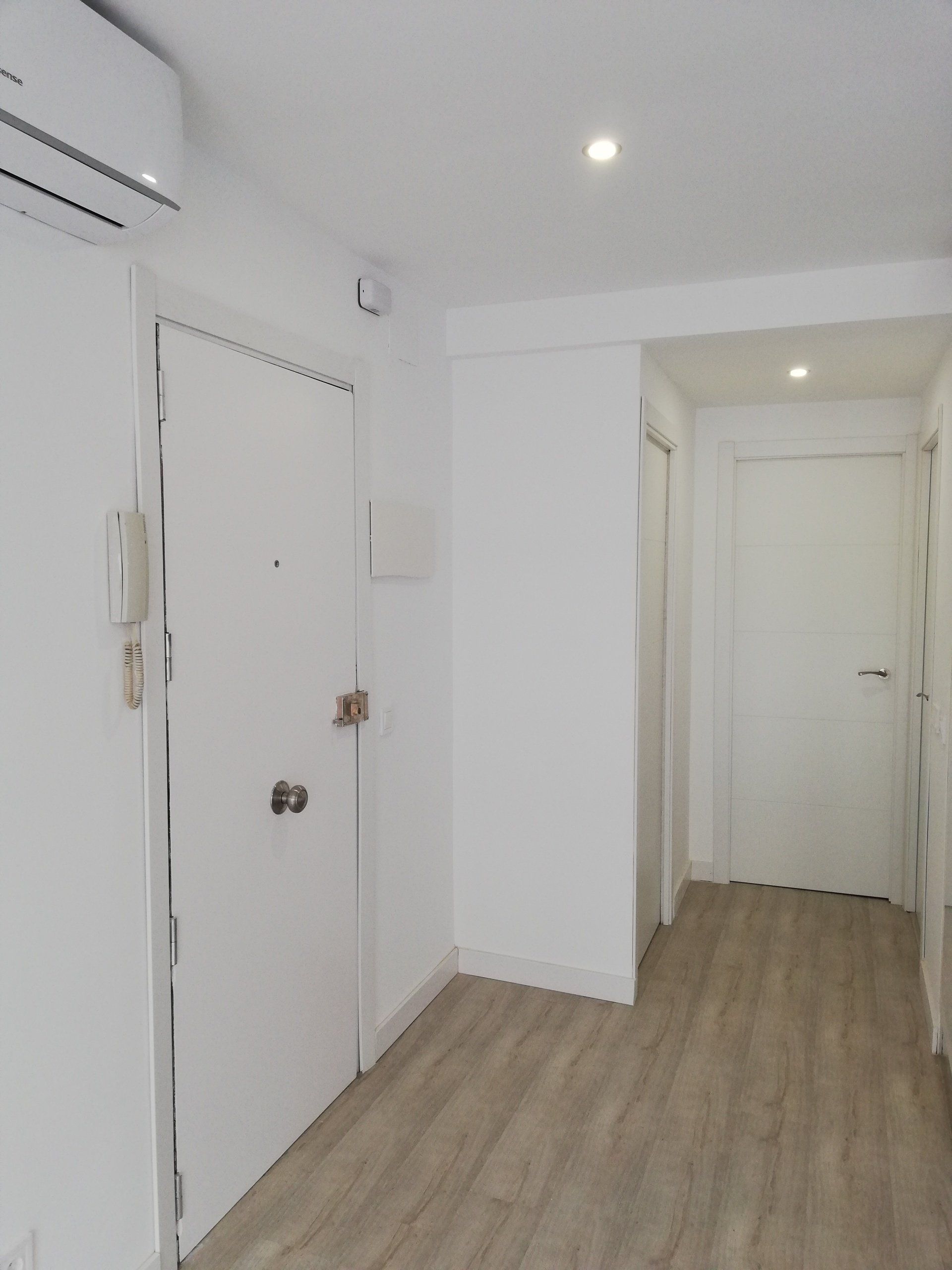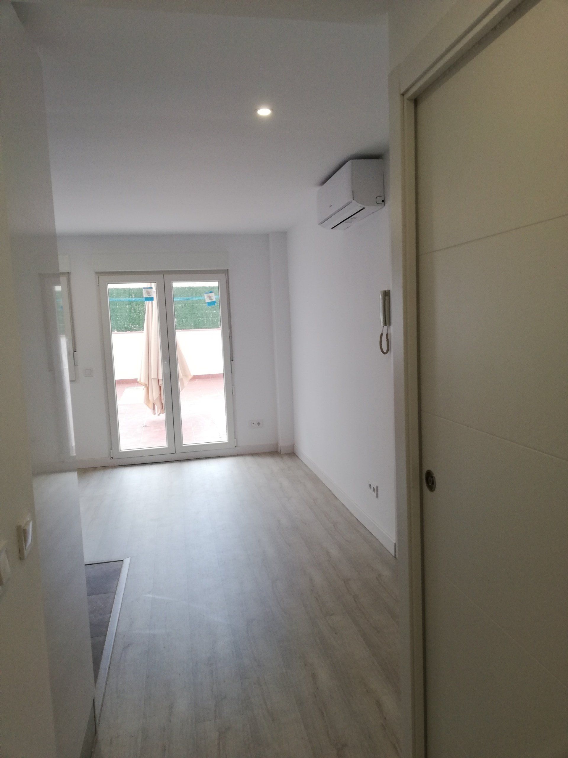 Renovación de instalaciones, cambio de suelo de toda la vivienda levantando el parquét antiguo y colocando un suelo porcelánico de color gris cemento, Instalación de aire acondicionado y cerramientos de PVC.