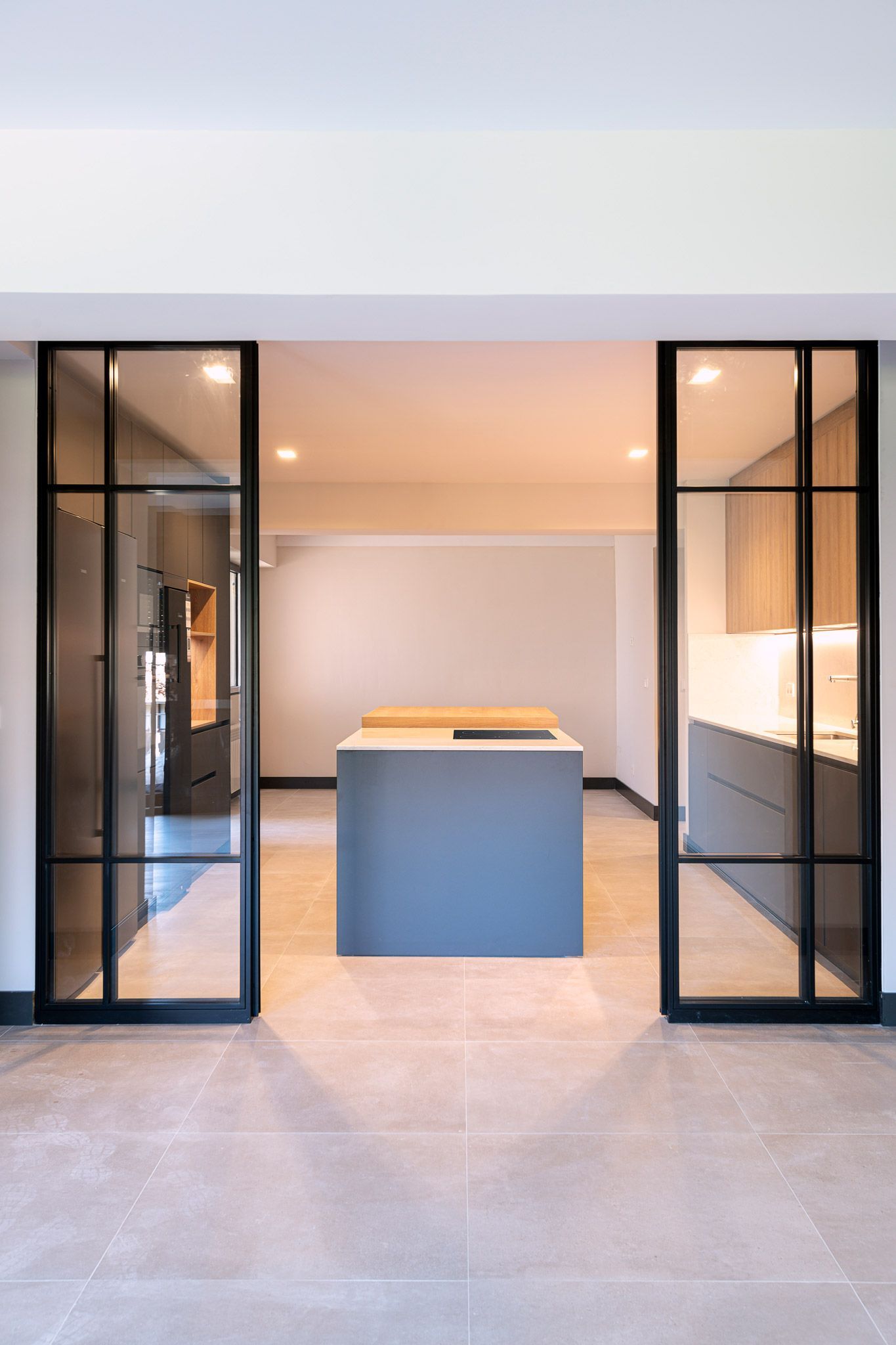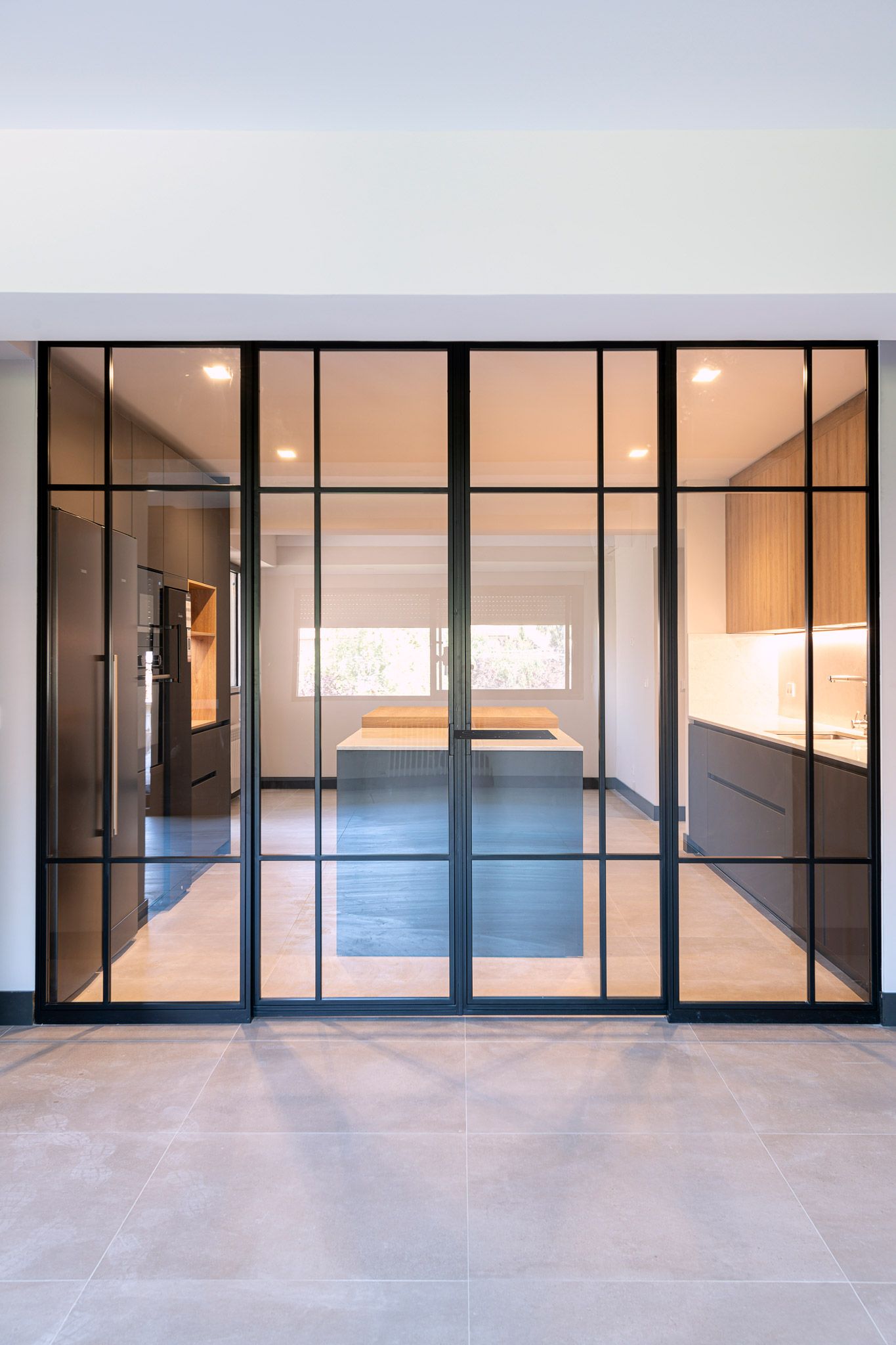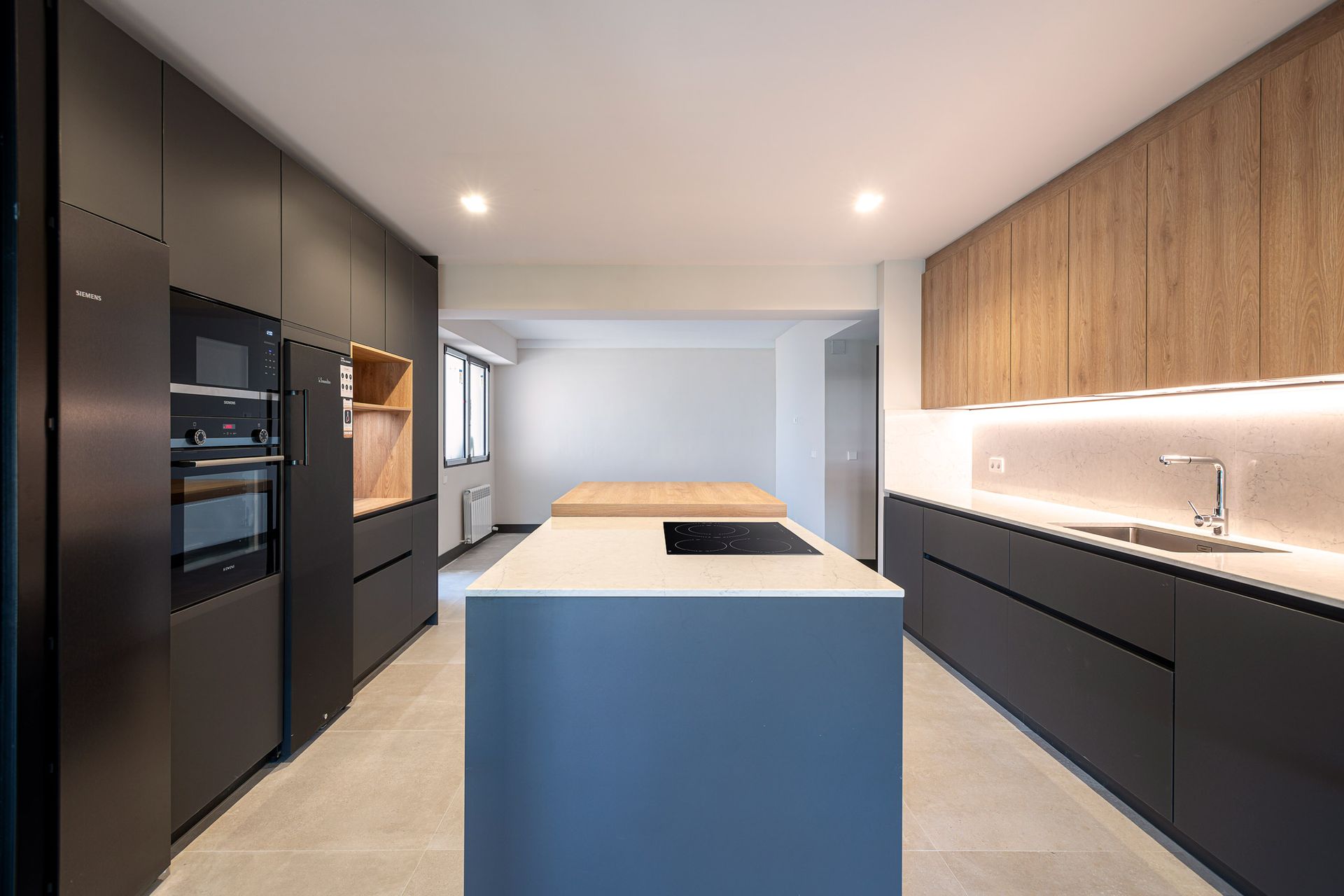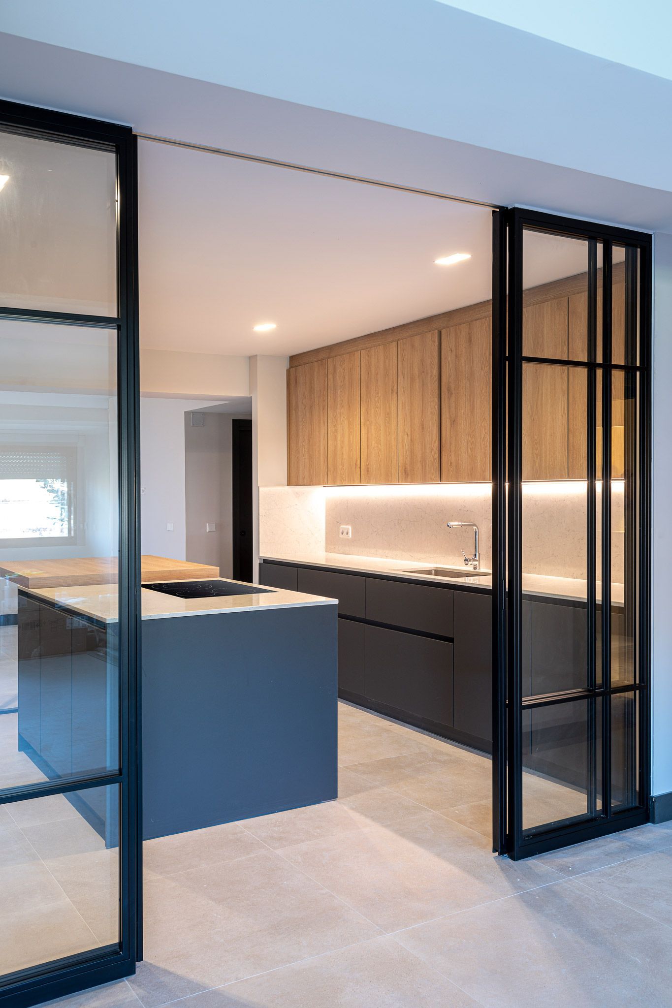 Demolición de tabiquería para comunicar cocina y salón. Demolición de tabique divisorio. Adaptación de instalaciones de electricidad, manteniendo las de fontanería. Mobiliario de cocina con isla central.